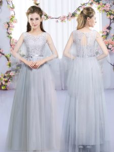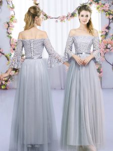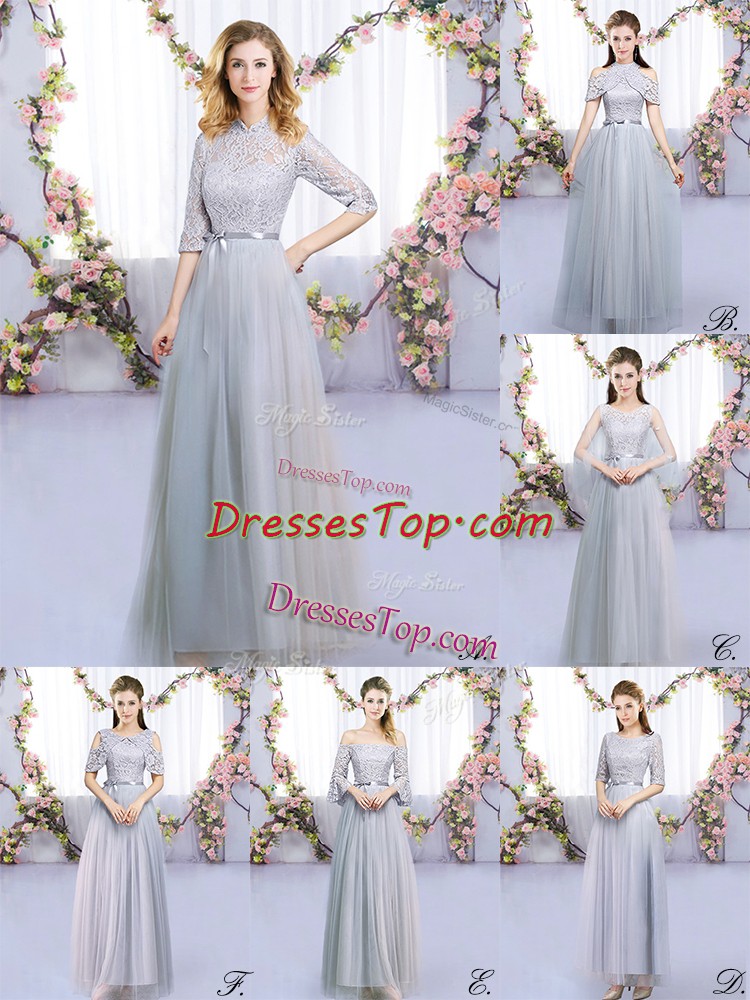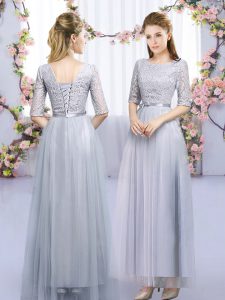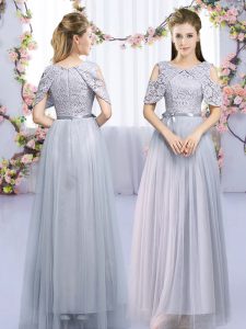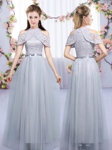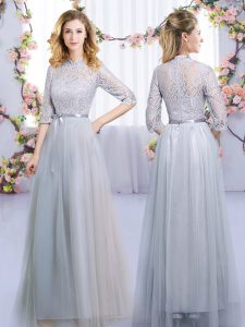 Grey Empire Tulle High-neck Half Sleeves Lace and Belt Floor Length Zipper Quinceanera Court Dresses