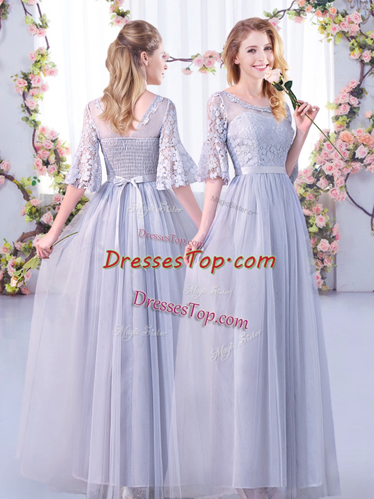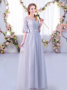 Grey Half Sleeves Floor Length Lace and Belt Side Zipper Dama Dress