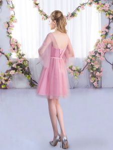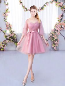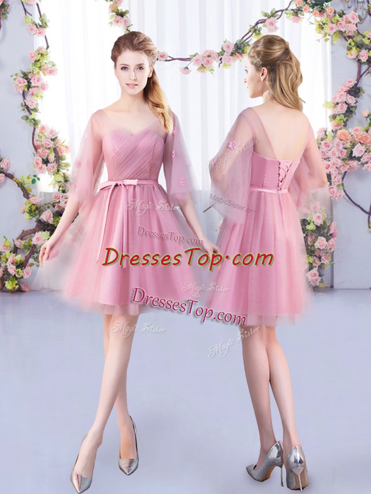 Half Sleeves Mini Length Appliques and Belt Lace Up Quinceanera Dama Dress with Pink