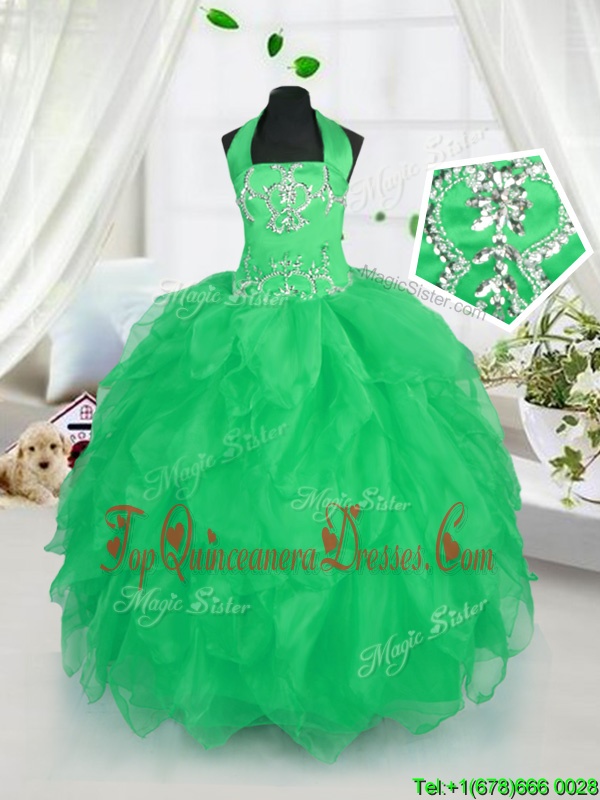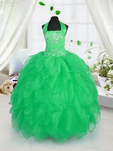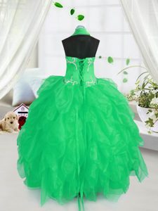 Halter Top Apple Green Ball Gowns Appliques and Ruffles Pageant Dresses Lace Up Organza Sleeveless Floor Length
