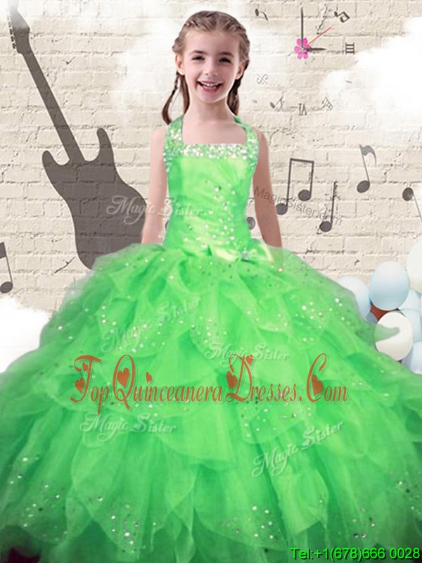 Halter Top Beading and Ruffles Pageant Gowns Green Lace Up Sleeveless Floor Length