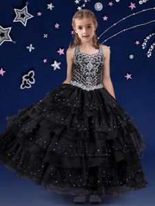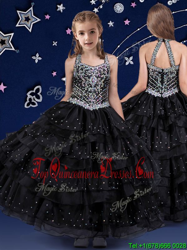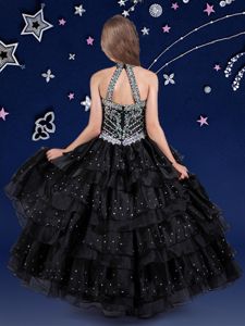 Halter Top Black Sleeveless Beading and Ruffled Layers Floor Length Child Pageant Dress