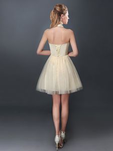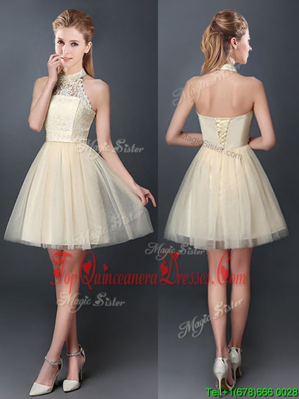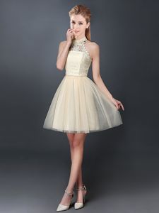 Halter Top Champagne A-line Lace and Appliques Court Dresses for Sweet 16 Lace Up Tulle Sleeveless Mini Length