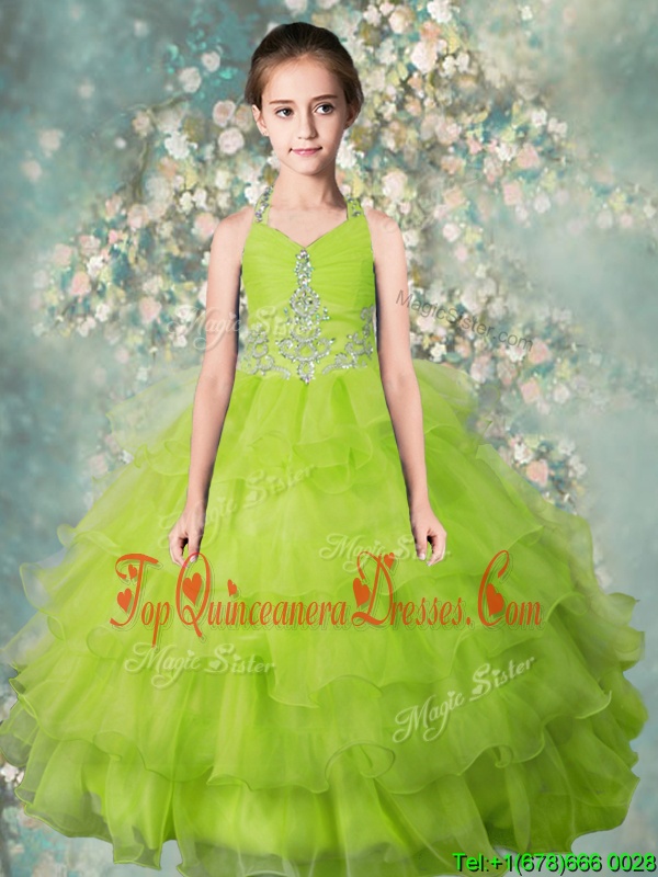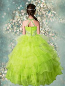 Halter Top Floor Length Zipper Pageant Gowns For Girls Yellow Green and In for Party and Wedding Party with Beading and Ruffled Layers