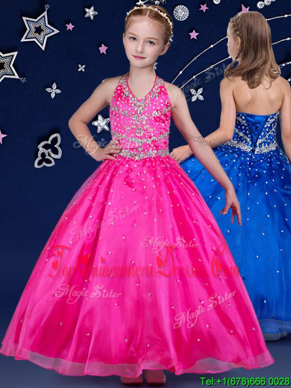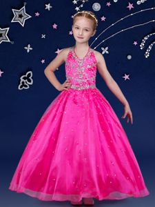 Halter Top Hot Pink Organza Lace Up Little Girls Pageant Gowns Sleeveless Floor Length Beading