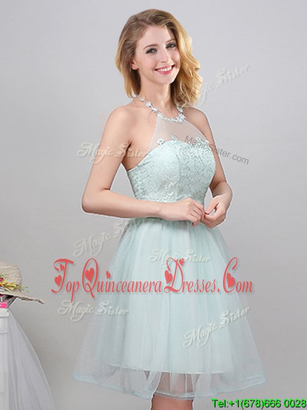 Halter Top Lace and Appliques and Belt Quinceanera Court Dresses Apple Green Lace Up Sleeveless Mini Length