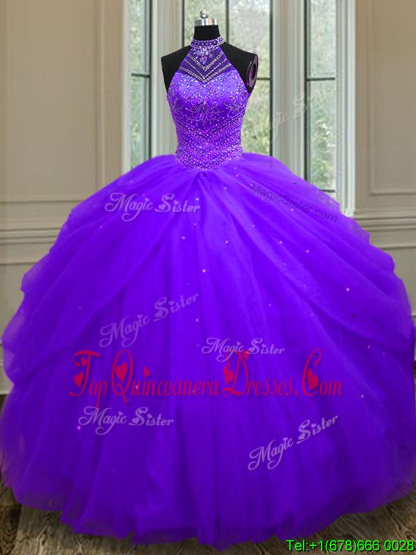 Halter Top Purple Lace Up Quinceanera Gowns Beading and Sequins Sleeveless Floor Length