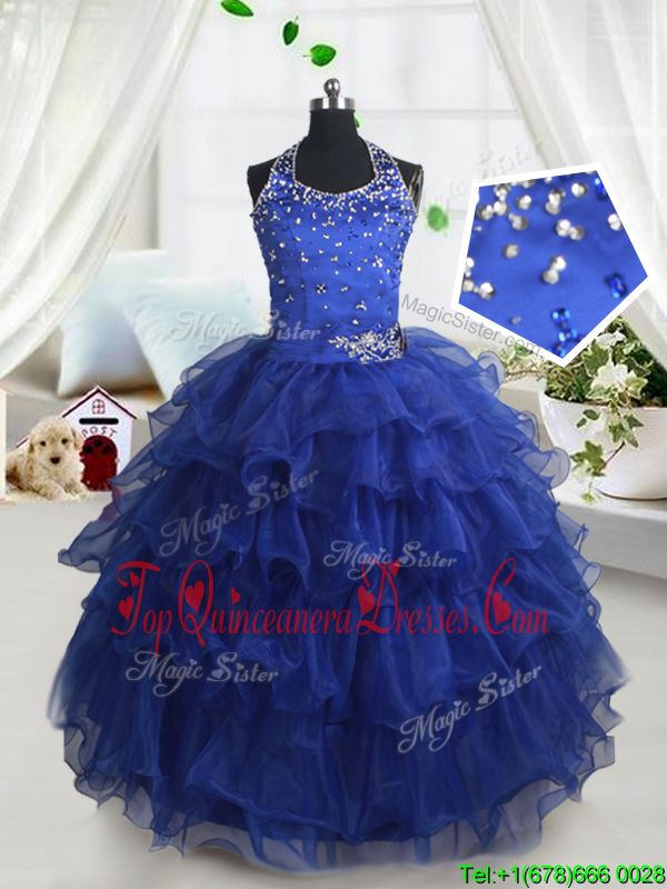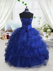 Halter Top Royal Blue Ball Gowns Beading and Ruffled Layers Kids Pageant Dress Lace Up Organza Sleeveless Floor Length