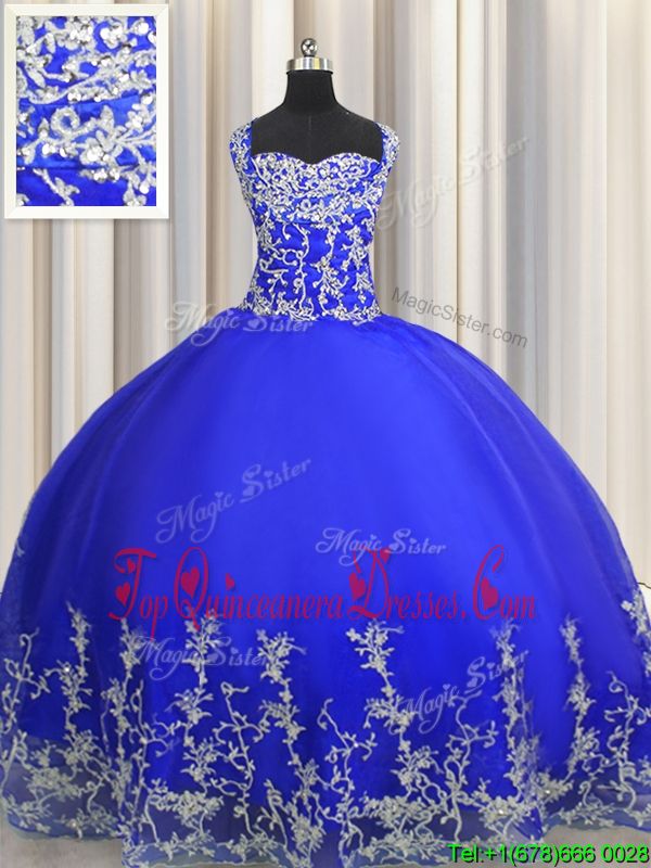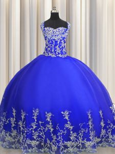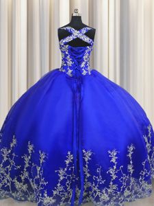 Halter Top Royal Blue Organza Lace Up Quinceanera Gown Sleeveless Floor Length Beading and Appliques