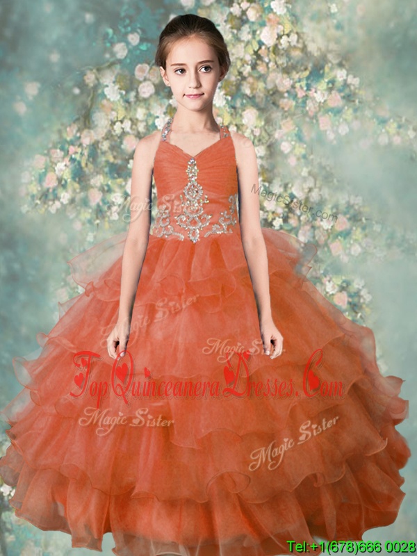 Halter Top Ruffled Floor Length Ball Gowns Sleeveless Orange Evening Gowns Zipper