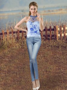Halter Top Sleeveless 15 Quinceanera Dress Court Train Embroidery and Ruffles Blue And White Organza