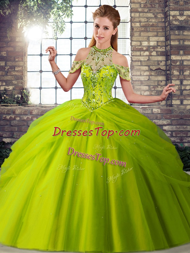 Halter Top Sleeveless Brush Train Lace Up Sweet 16 Dresses Olive Green Tulle