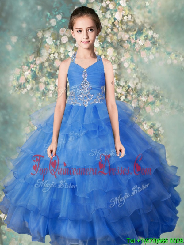 Halter Top Sleeveless Floor Length Beading and Ruffled Layers Zipper Child Pageant Dress with Baby Blue