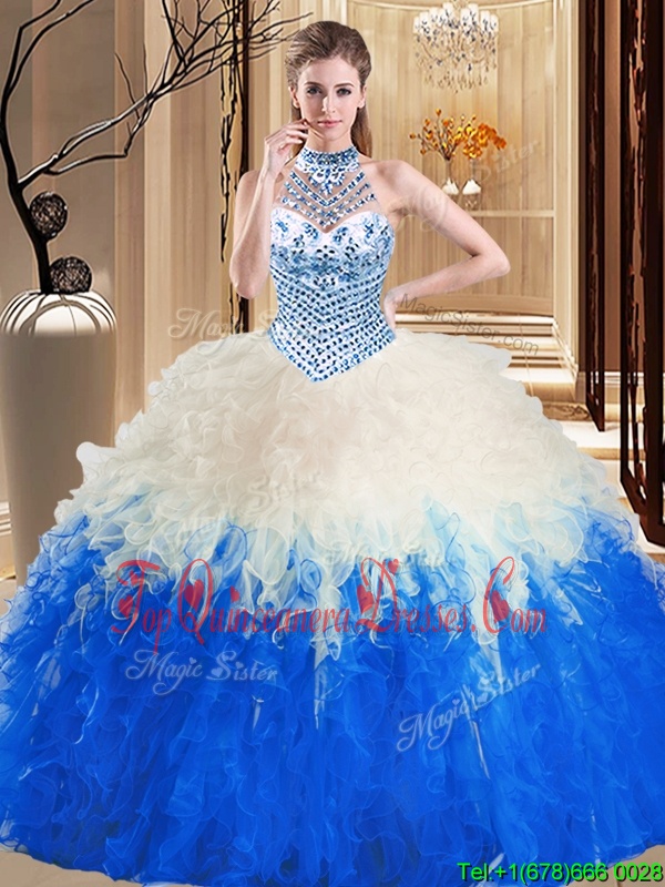 Halter Top Sleeveless Floor Length Beading and Ruffles Lace Up Ball Gown Prom Dress with Blue And White