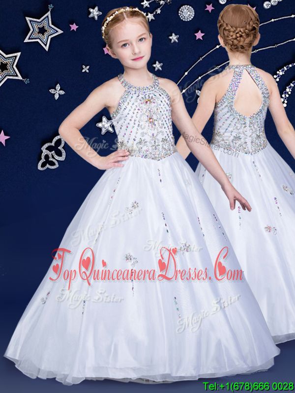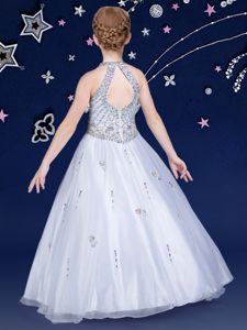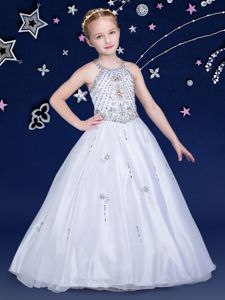 Halter Top Sleeveless Floor Length Beading Zipper Kids Pageant Dress with White