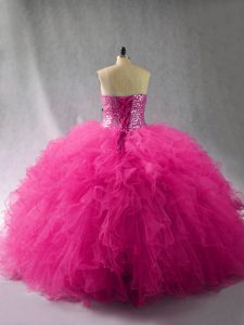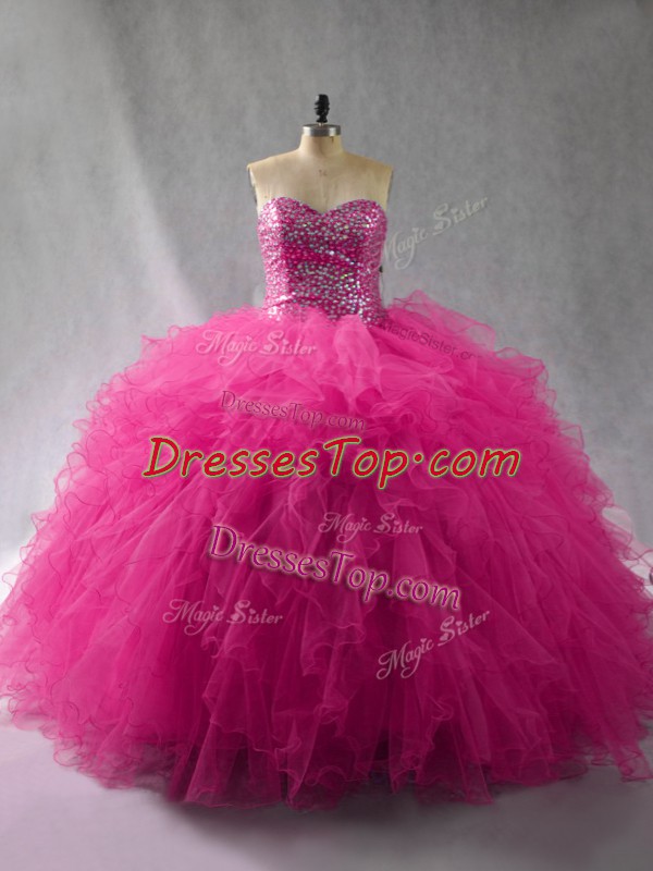 Halter Top Sleeveless Lace Up Ball Gown Prom Dress Fuchsia Tulle