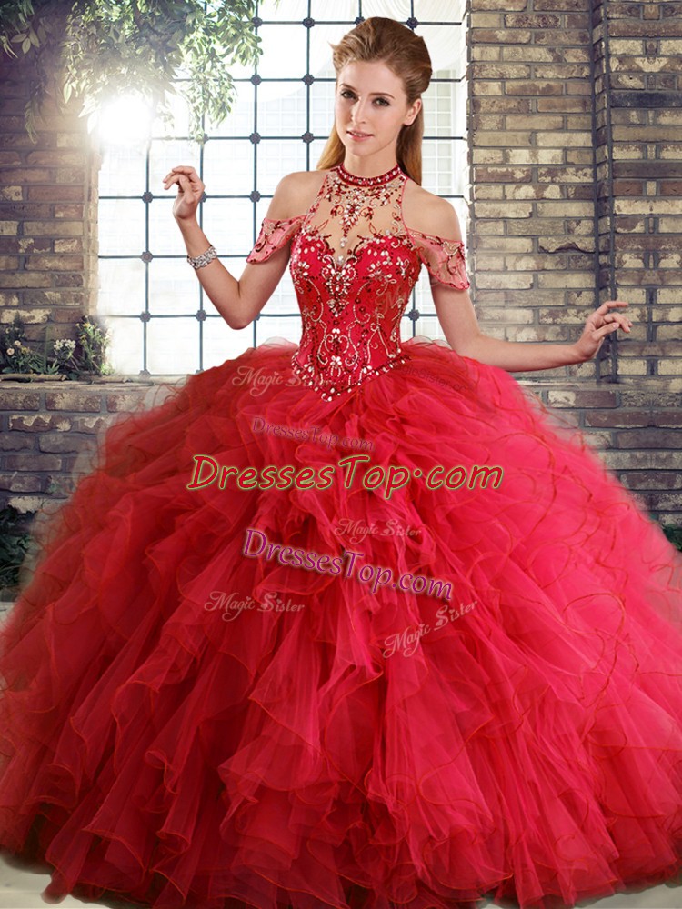 Halter Top Sleeveless Lace Up Sweet 16 Dress Red Tulle