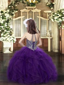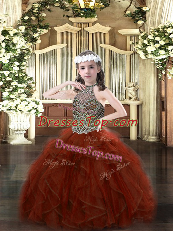Halter Top Sleeveless Little Girls Pageant Dress Wholesale Floor Length Beading and Ruffles Rust Red Organza