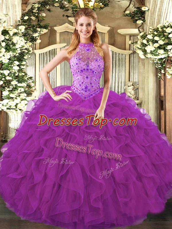 Halter Top Sleeveless Organza 15th Birthday Dress Beading and Ruffles Lace Up