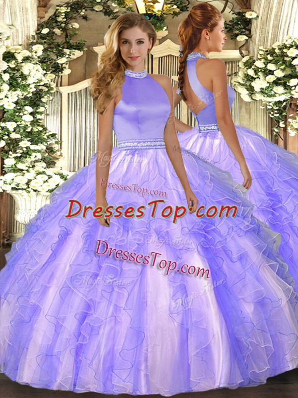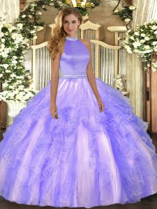 Halter Top Sleeveless Organza Quince Ball Gowns Beading and Ruffles Backless
