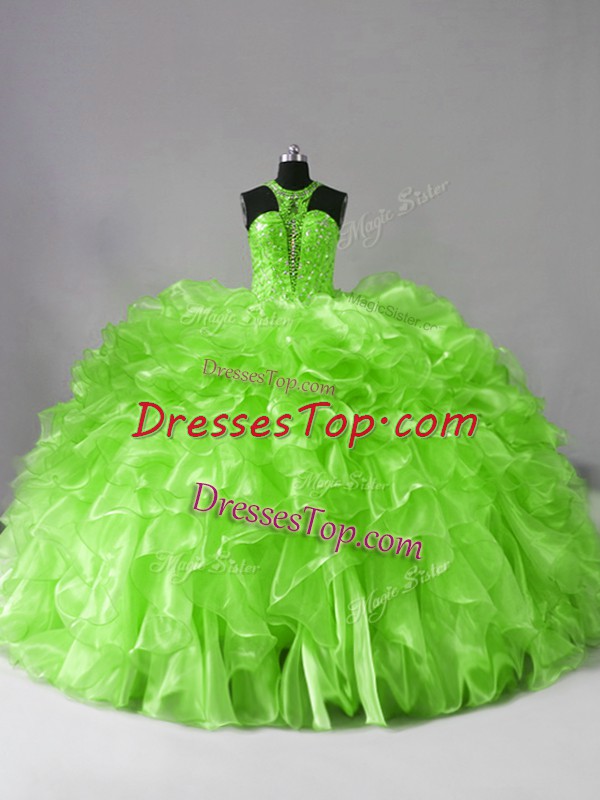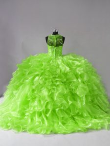 Halter Top Sleeveless Organza Sweet 16 Quinceanera Dress Beading and Ruffles Brush Train Zipper
