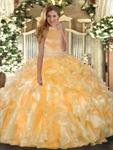 Halter Top Sleeveless Quince Ball Gowns Floor Length Beading and Ruffles Gold Organza