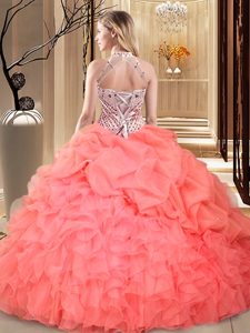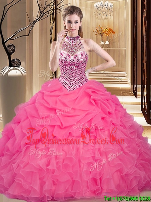 Halter Top Sleeveless Quinceanera Dress Floor Length Beading and Ruffles and Pick Ups Hot Pink Organza