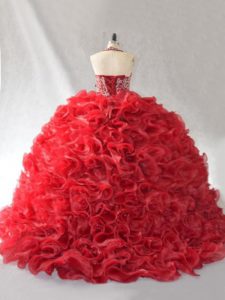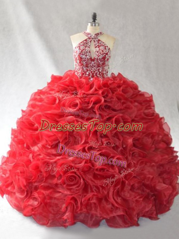 Halter Top Sleeveless Quinceanera Dresses Brush Train Beading and Ruffles Red Organza