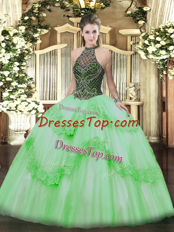 Halter Top Sleeveless Quinceanera Dresses Floor Length Beading and Appliques Taffeta and Tulle