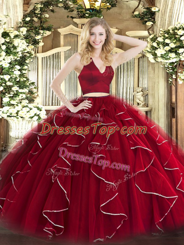 Halter Top Sleeveless Sweet 16 Dress Floor Length Ruffles Wine Red Organza