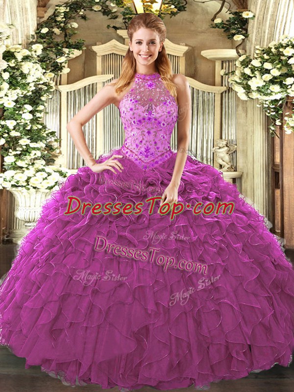 Halter Top Sleeveless Sweet 16 Dresses Floor Length Embroidery and Ruffles Fuchsia Organza