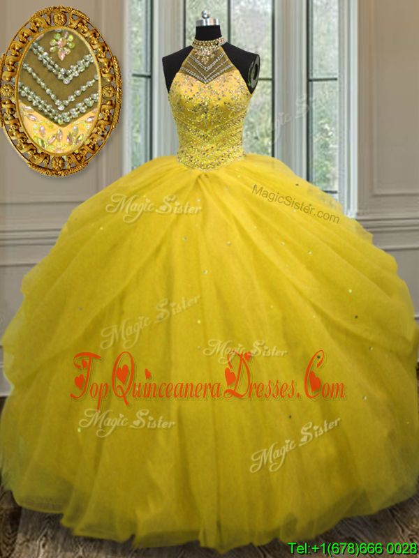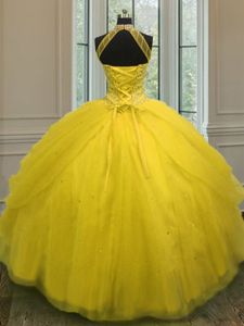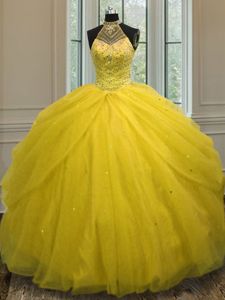 Halter Top Sleeveless Sweet 16 Quinceanera Dress Floor Length Beading Gold Tulle