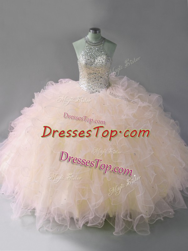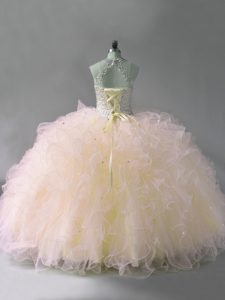Halter Top Sleeveless Tulle Quinceanera Gown Beading and Ruffles Lace Up
