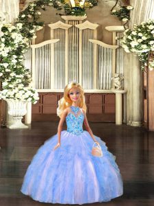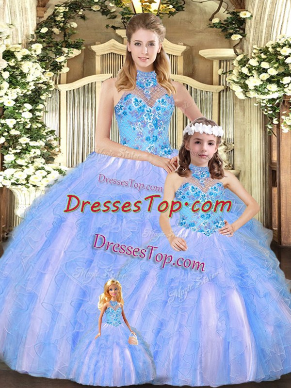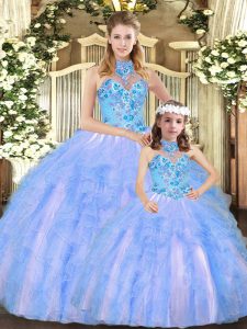 Halter Top Sleeveless Tulle Sweet 16 Dress Embroidery and Ruffles Lace Up