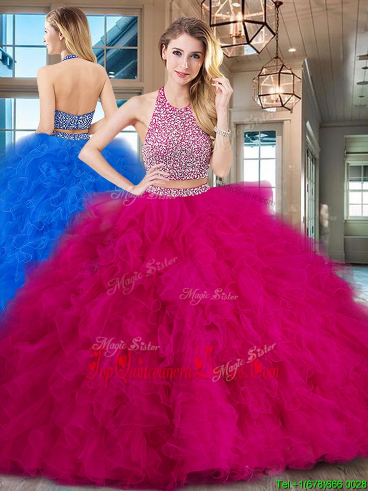 Halter Top With Train Two Pieces Sleeveless Fuchsia Sweet 16 Dress Brush Train Backless