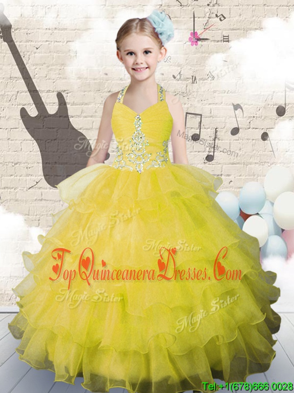 Halter Top Yellow Green Organza Lace Up Pageant Dress for Girls Sleeveless Floor Length Beading and Ruffled Layers
