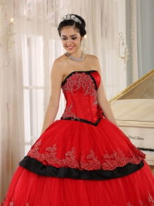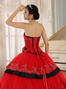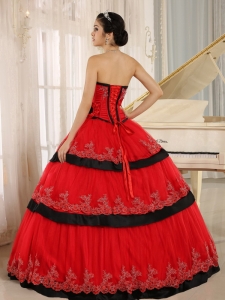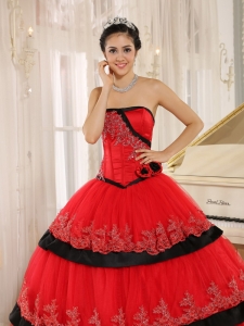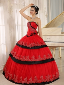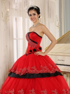 Hand Made Flowers Quinceanera Dress Red and Black Layered