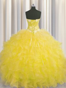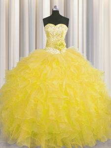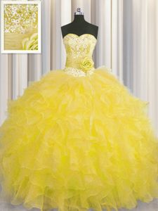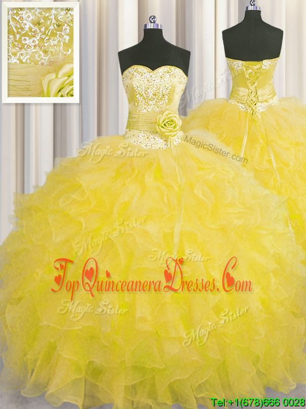 Handcrafted Flower Gold Sleeveless Organza Lace Up Ball Gown Prom Dress for Military Ball and Sweet 16 and Quinceanera