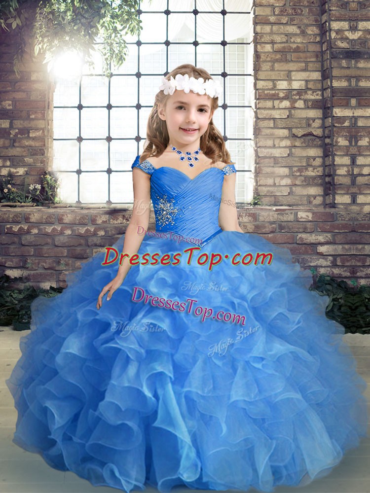 High Class Beading and Ruching Little Girls Pageant Dress Wholesale Blue Lace Up Sleeveless Floor Length
