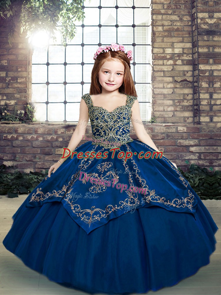 High Class Blue Straps Neckline Beading and Embroidery Little Girl Pageant Gowns Sleeveless Lace Up