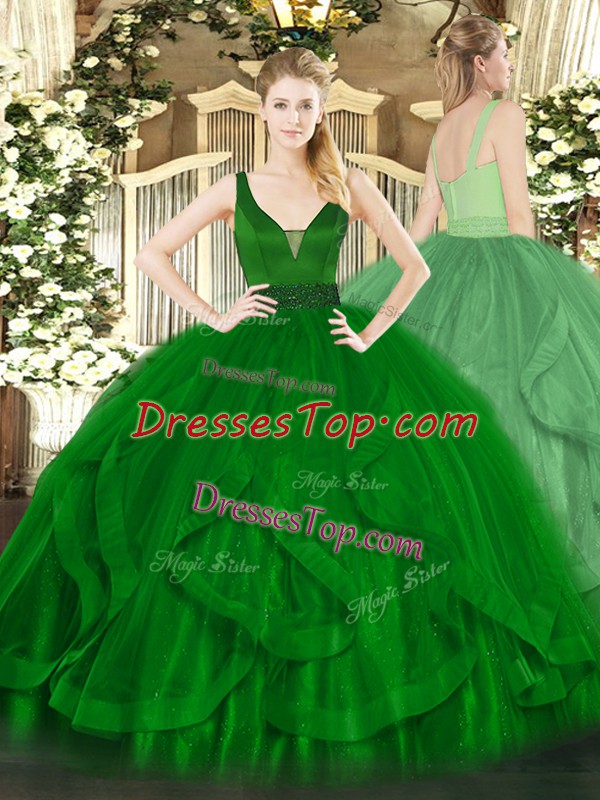 High Class Dark Green Ball Gowns Beading and Ruffles 15 Quinceanera Dress Zipper Tulle Sleeveless Floor Length