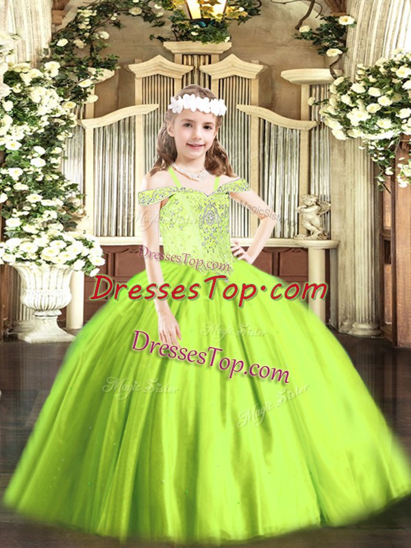 High Class Floor Length Yellow Green Pageant Dress for Womens Tulle Sleeveless Beading