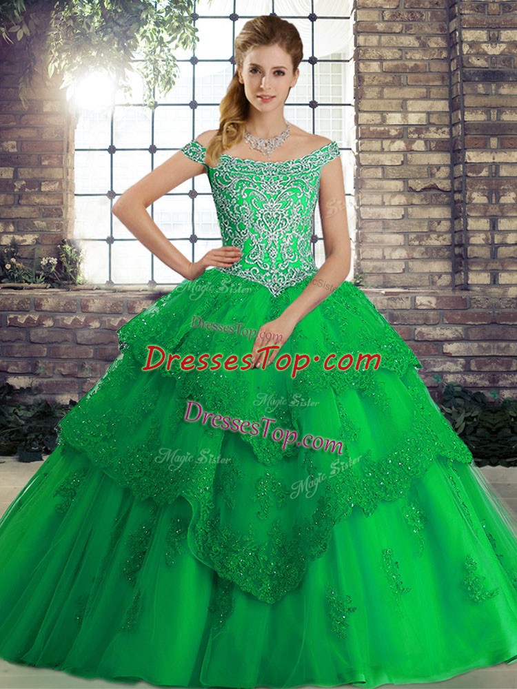 High Class Green Vestidos de Quinceanera Off The Shoulder Sleeveless Brush Train Lace Up