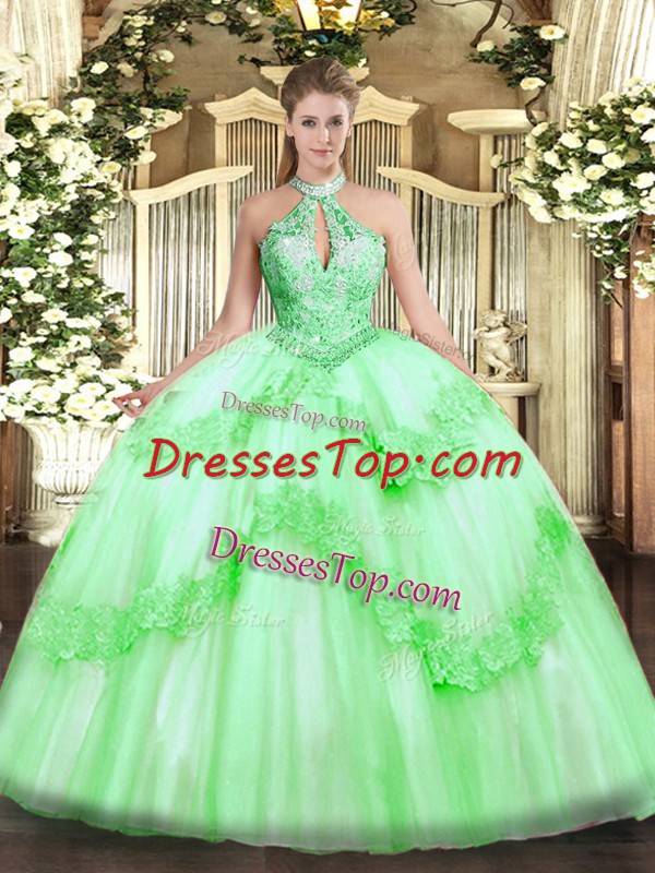 High Class Halter Top Sleeveless Tulle Quinceanera Gowns Appliques and Sequins Lace Up