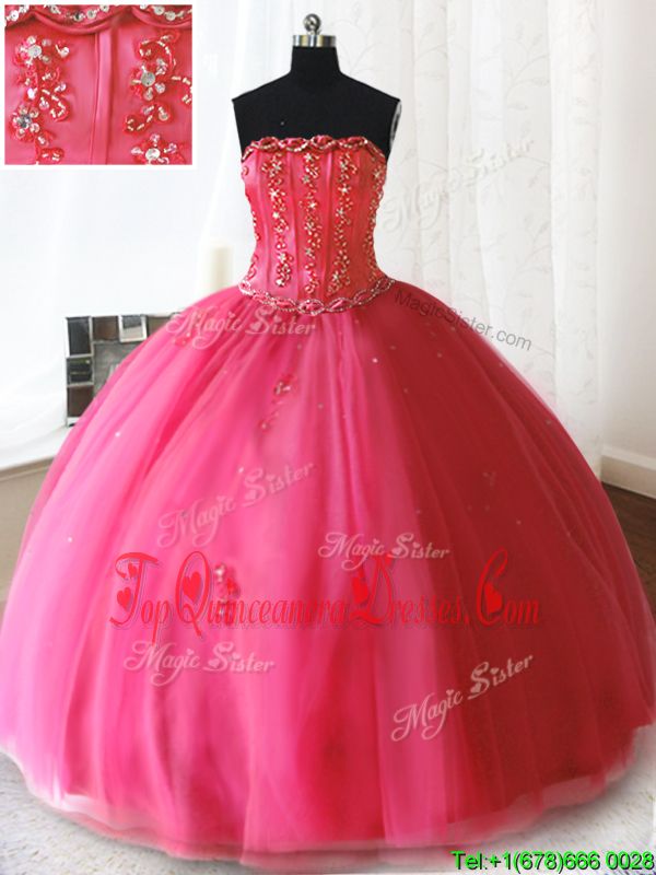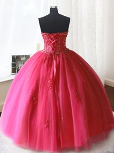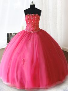High Class Hot Pink Ball Gowns Beading and Appliques Sweet 16 Dresses Lace Up Tulle Sleeveless Floor Length