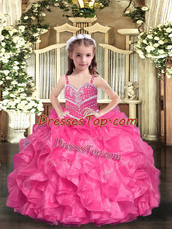 High Class Hot Pink Straps Neckline Beading and Ruffles Little Girl Pageant Dress Sleeveless Lace Up