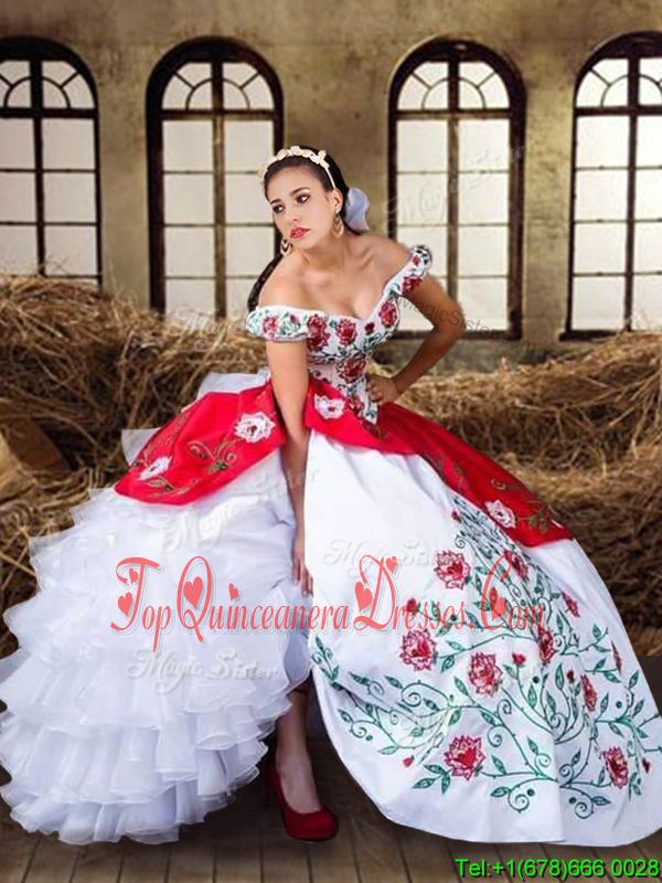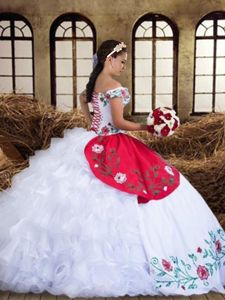High Class Off the Shoulder Ruffled Floor Length Ball Gowns Cap Sleeves White and Red Quinceanera Gowns Lace Up