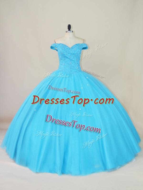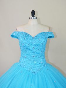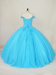 High Class Off The Shoulder Sleeveless Quinceanera Gowns Floor Length Beading Blue Tulle