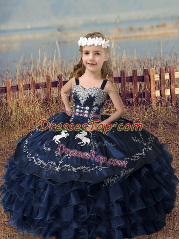 High Class Organza Straps Sleeveless Lace Up Embroidery and Ruffled Layers Little Girl Pageant Dress in Navy Blue