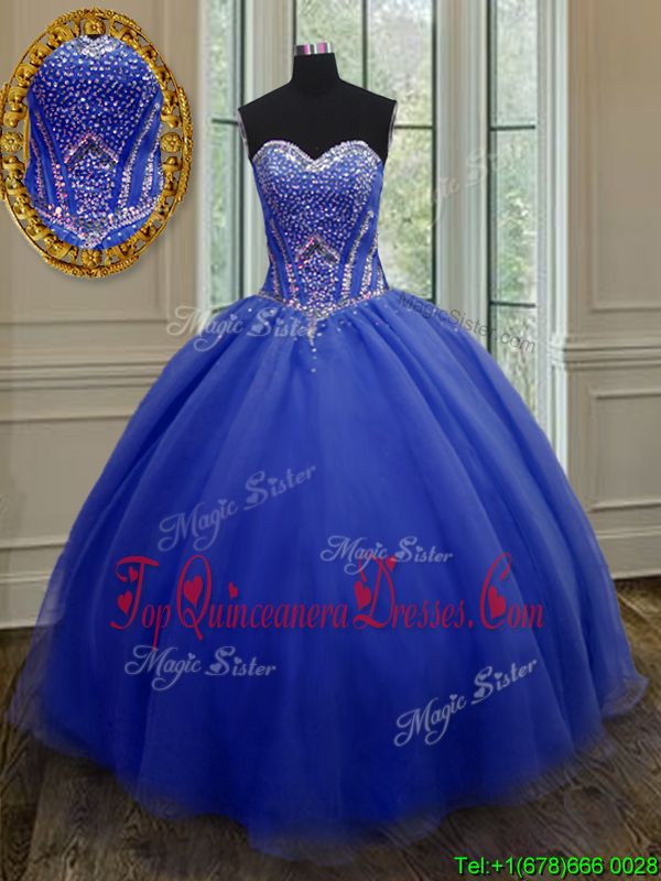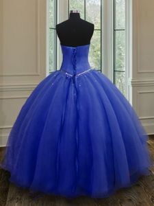 High Class Organza Sweetheart Sleeveless Lace Up Beading and Belt Quinceanera Gown in Royal Blue